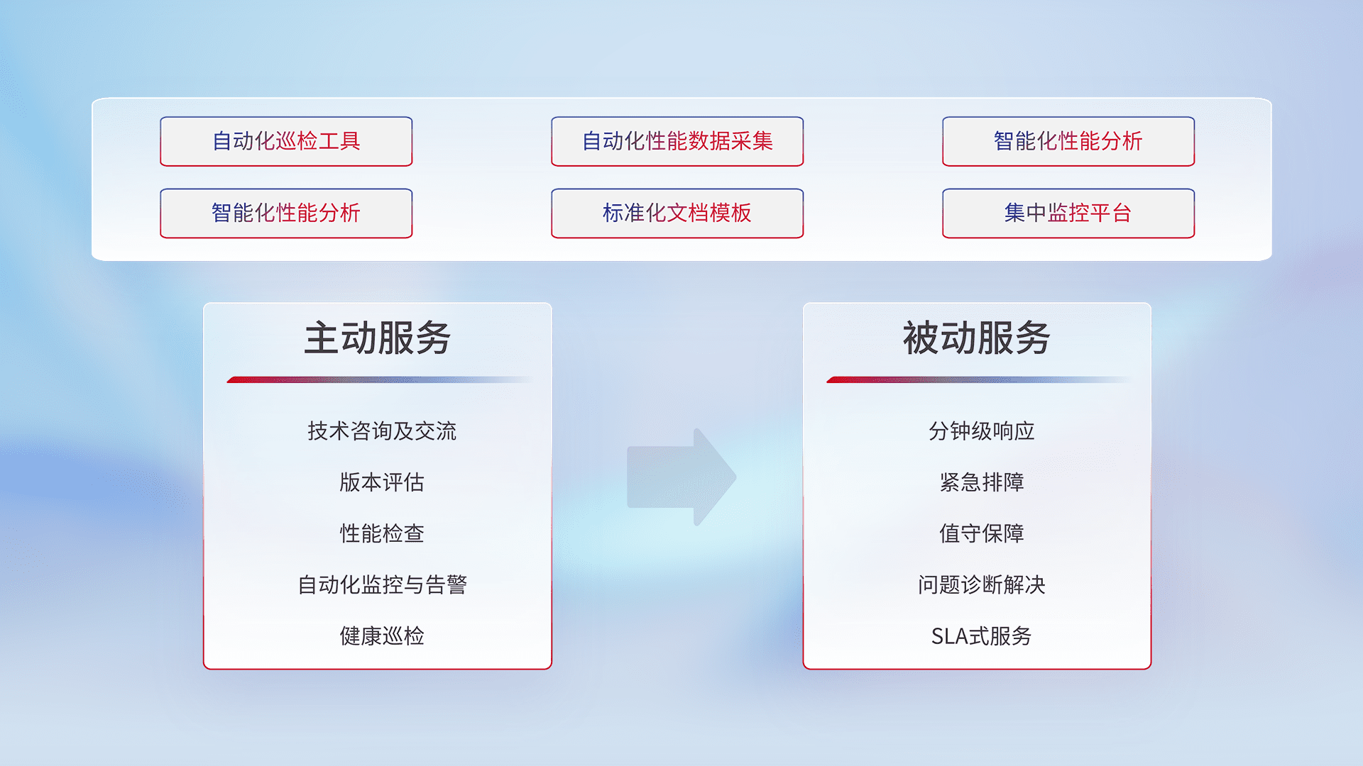 智能化工具和标准化文档,,,,保障服务质量,,提供主动服务(包含技术咨询、、、、版本评估、、性能检查、、自动化监控与告警、、健康巡检)和被动服务包含(分钟级响应、、、、紧急排障、、、值守保障、、问题诊断解决、、、、SLA服务)。。。。